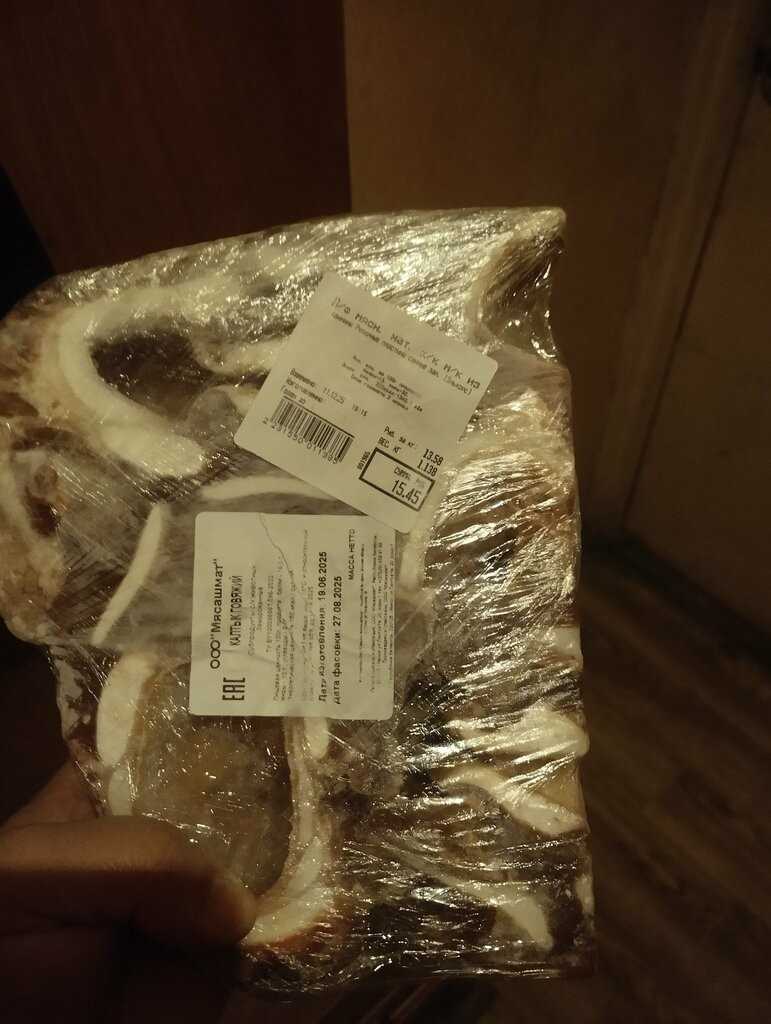 Когда пришла очередь делать для собаки кашу, достал калтык на разморозку, положил в миску, всё как всегда. Прошло часов шесть пока продукт оттаял. Начал срывать плёнку с обратной стороны. Обратил внимание на ценник который приклеила кассирша.