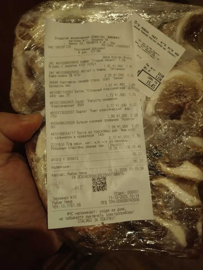 Оказывается, она пробила калтык по цене «Реберные пластины свинные (Эльхорс)», цена которого выше в два раза! Вес этой упаковки 1кг 138 грамм. Цена Калтыка в магазине примерно в два раза ниже.